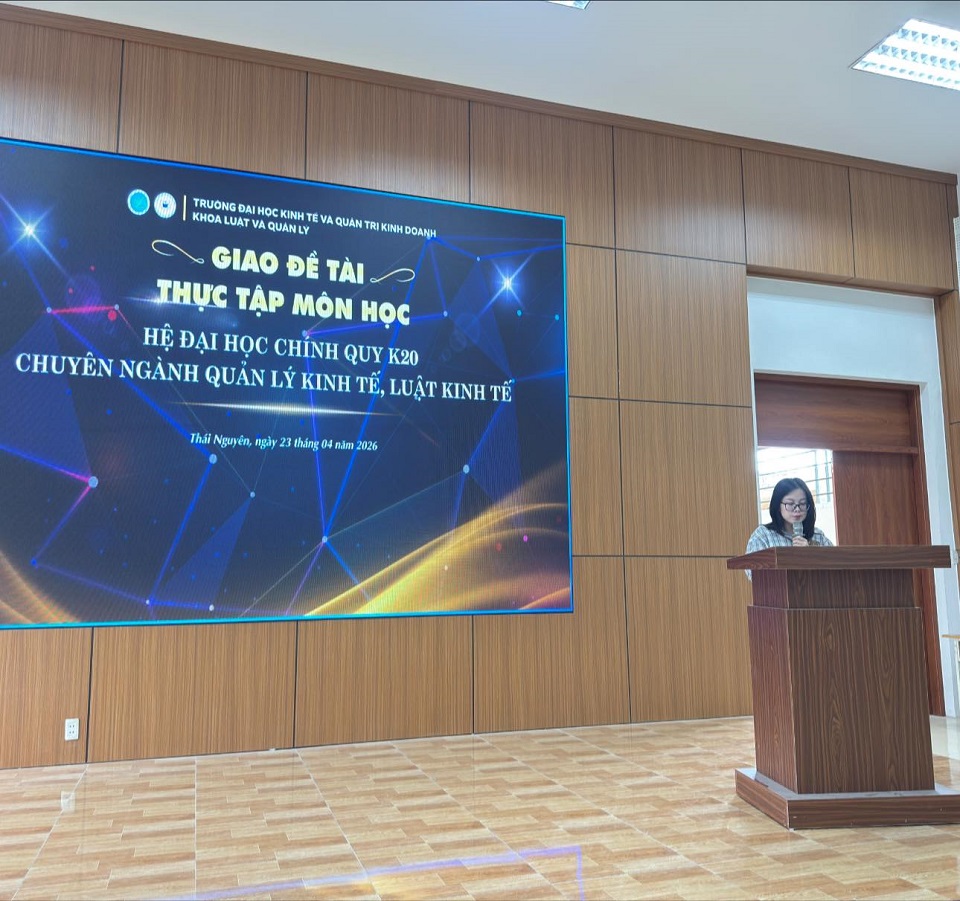 23/04/2026Chiều ngày 23/4/2026, tại Phòng 301 - Tòa nhà B1, Trường Đại học Kinh tế và Quản trị kinh doanh, Khoa Luật và Quản lý đã tổ chức buổi giao đề tài thực tập môn học cho sinh viên hệ đại học chính quy K20, chuyên ngành Quản lý kinh tế và Luật kinh tế.