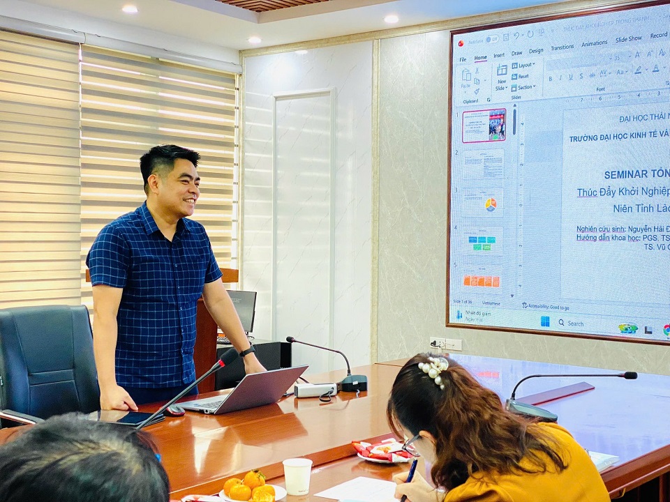 Dưới sự hướng dẫn tận tâm của PGS.TS. Đinh Hồng Linh và TS. Vũ Quỳnh Nam, nghiên cứu sinh Nguyễn Hải Đăng đã thể hiện sự nghiêm túc trong nghiên cứu, tư duy khoa học rõ ràng và tinh thần cầu thị trong tiếp thu ý kiến. Chúc mừng nghiên cứu sinh Nguyễn Hải Đăng đã hoàn thành thành công buổi seminar quan trọng này, chúc nghiên cứu sinh tiếp tục hoàn thiện luận án với nhiều kết quả giá trị, đóng góp thiết thực cho phát triển khởi nghiệp thanh niên, đặc biệt tại tỉnh Lào Cai.