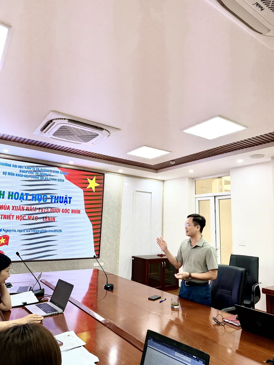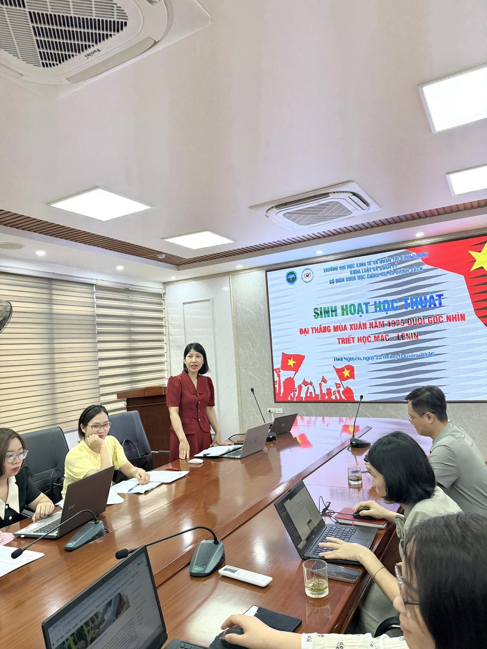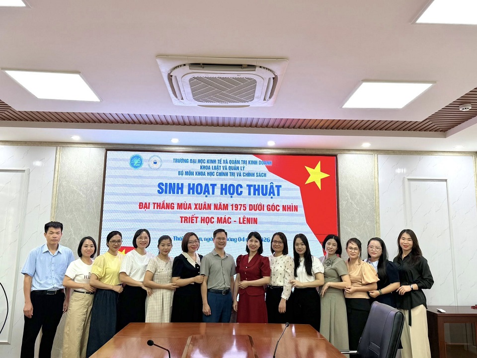 22/04/2026Nhằm tiếp tục nâng cao chất lượng giảng dạy, nghiên cứu khoa học và phát huy vai trò của đội ngũ giảng viên lý luận chính trị trong bối cảnh cuộc Cách mạng công nghiệp 4.0 và tích cực hướng tới chào mừng ngày Giải phóng miền Nam, thống nhất đất nước (30.4.1975- 30.4.2026), ngày 22/4/2026, tại Phòng họp C - Tòa nhà A1, Trường Đại học Kinh tế và Quản trị kinh doanh, Bộ môn Khoa học Chính trị và Chính sách thuộc Khoa Luật và Quản lý đã tổ chức thành công buổi sinh hoạt học thuật với chủ đề: “ĐẠI THẮNG MÙA XUÂN NĂM 1975 - DƯỚI GÓC NHÌN TRIẾT HỌC MÁC - LÊNIN”.