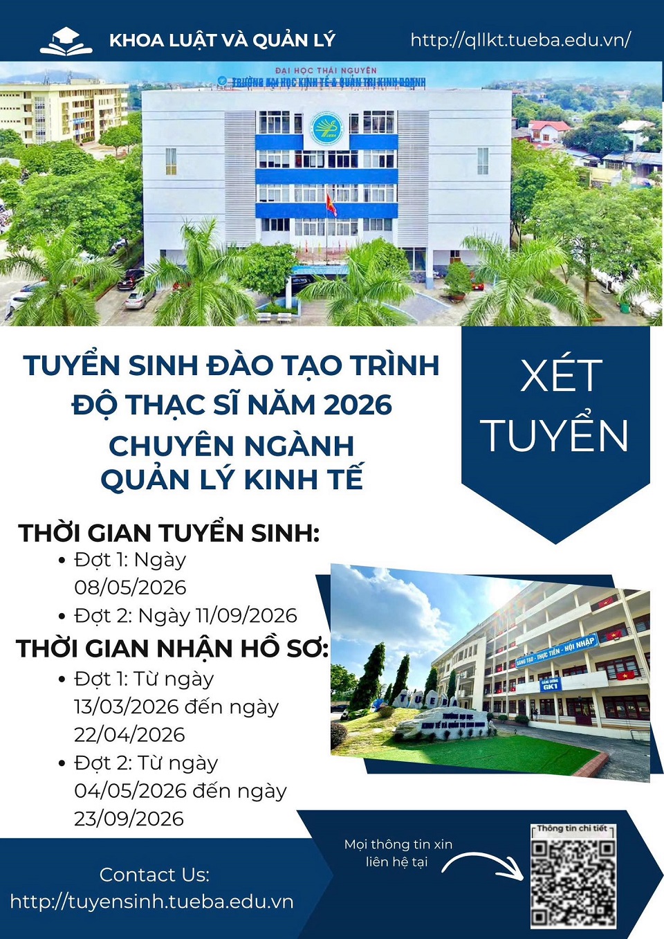 Nhằm đáp ứng nhu cầu nâng cao trình độ chuyên môn trong bối cảnh kinh tế ngày càng đổi mới, Trường Đại học Kinh tế và Quản trị kinh doanh thông báo tuyển sinh đào tạo trình độ Thạc sĩ năm 2026 với nhiều ngành đào tạo, trong đó có ngành Quản lý kinh tế.